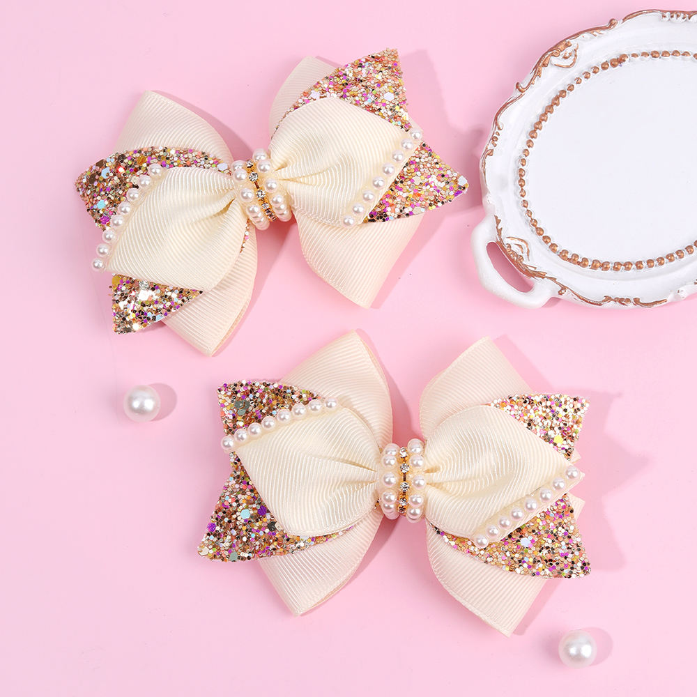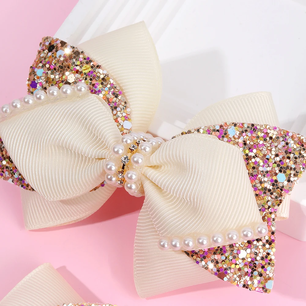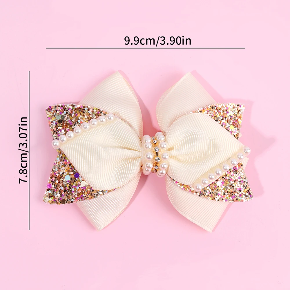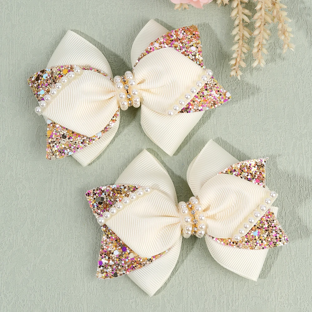 CN 2Pcs Boutique Ribbon Hair Bow Clip Sparkly Glitter Pins White Pearl Barrette Pigtails Hair Clip Girls Kids