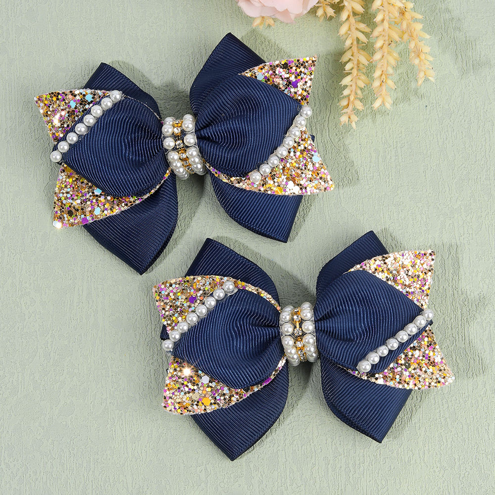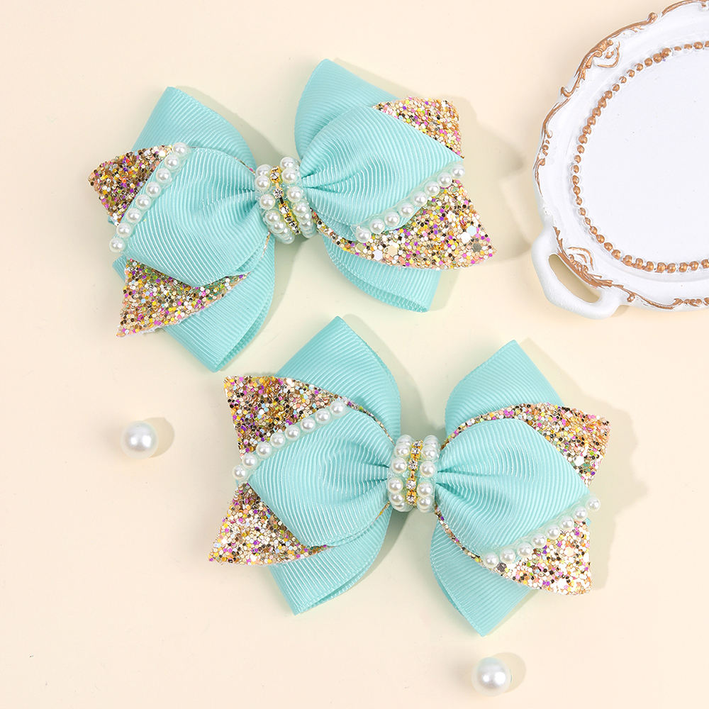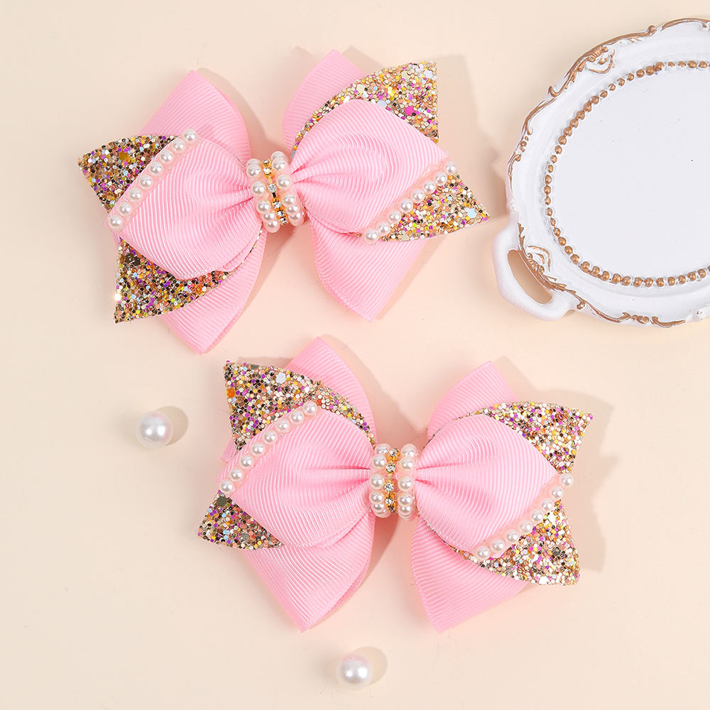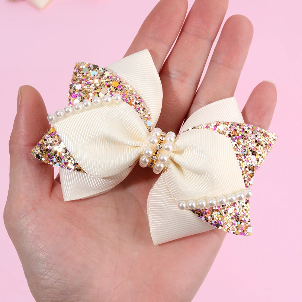 CN 2Pcs Boutique Ribbon Hair Bow Clip Sparkly Glitter Pins White Pearl Barrette Pigtails Hair Clip Girls Kids